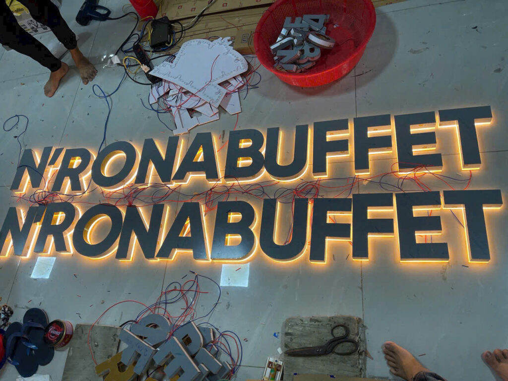 Gia công cắt CNC, uốn nổi – lắp LED (nếu có).